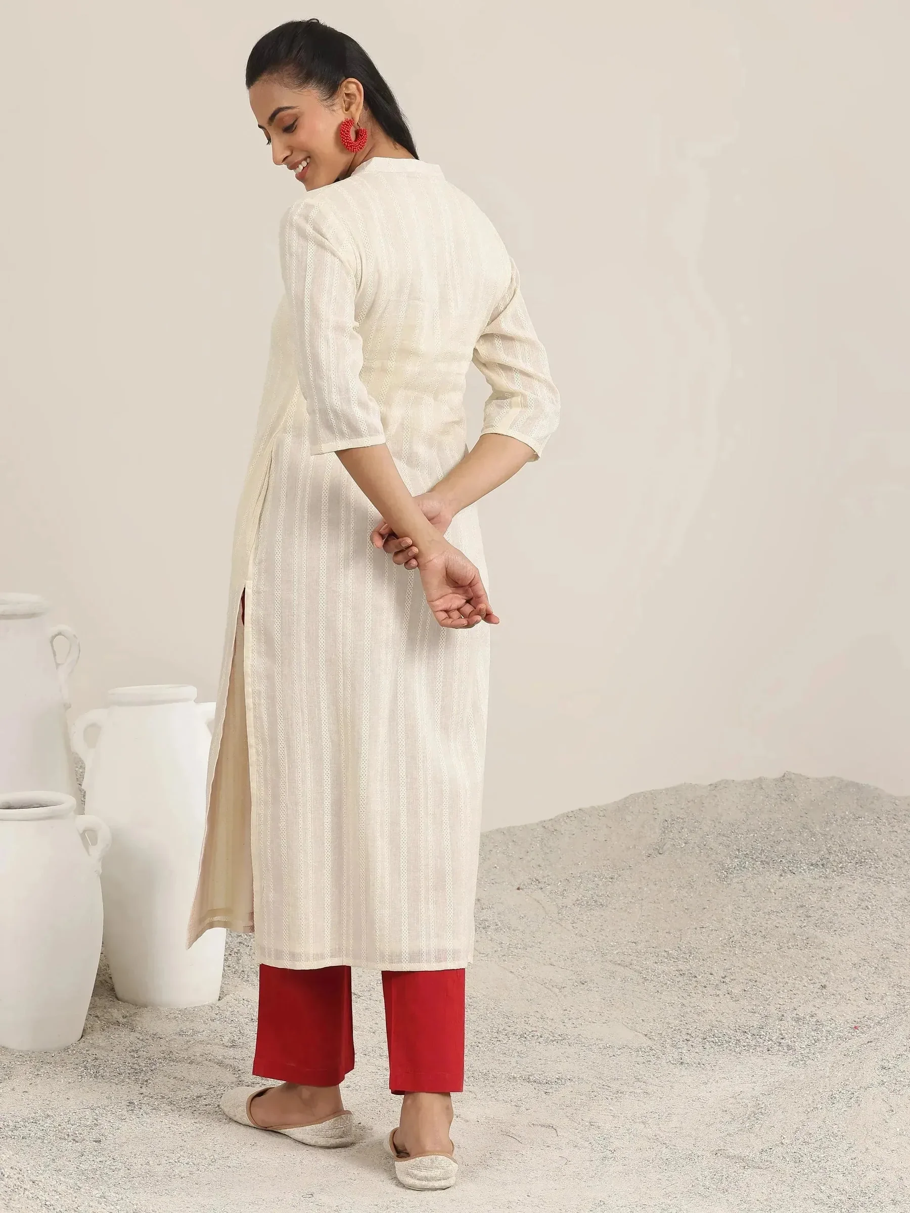 Off White Woven Design Cotton Straight Kurta